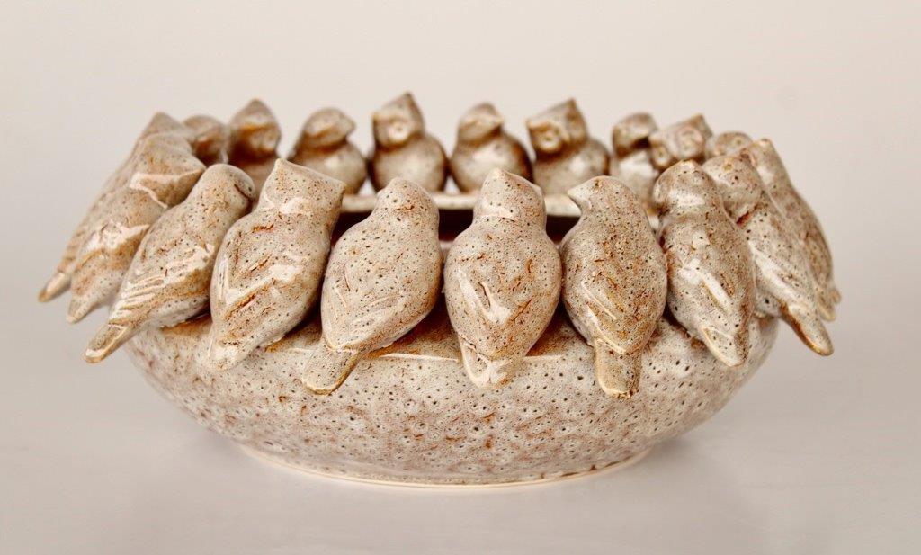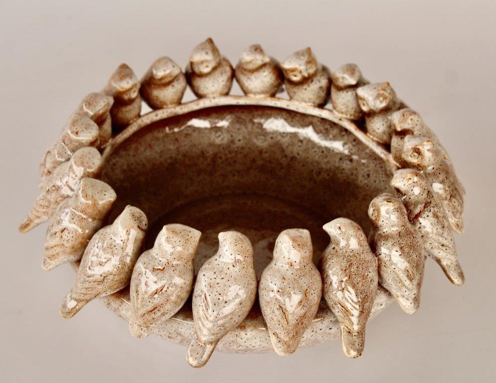 CERAMIC BROWN SPECKLED BOWL WITH BIRDS & OWLS SITTING ON EDGE – 15X40CM